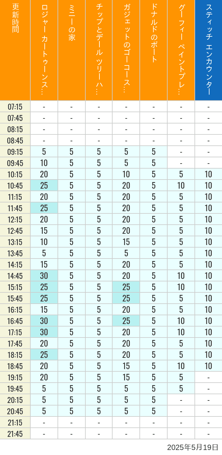 Waiting times for each attraction at Tokyo Disneyland on May 19, 2025. This is a table of wait times. It is color-coded in 30-minute increments.