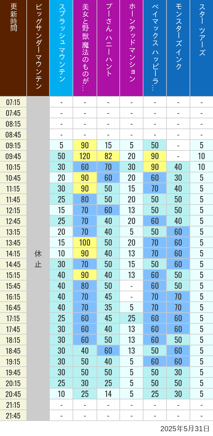 Waiting times for each attraction at Tokyo Disneyland on May 31, 2025. This is a table of wait times. It is color-coded in 30-minute increments.