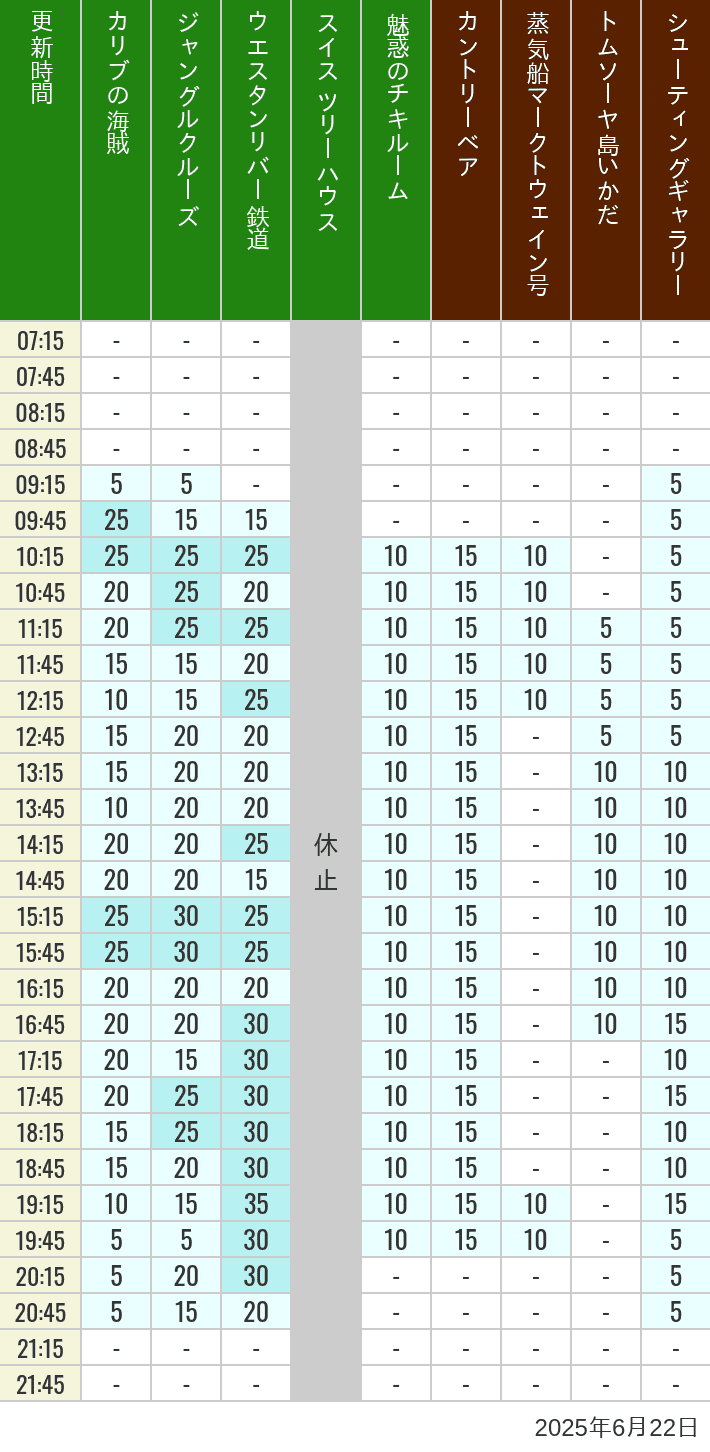 Waiting times for each attraction at Tokyo Disneyland on June 22, 2025. This is a table of wait times. It is color-coded in 30-minute increments.