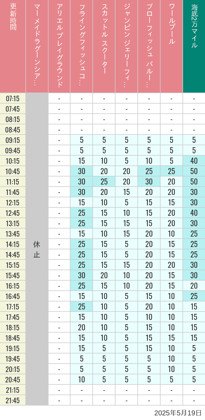 Waiting times for each attraction at Tokyo DisneySea on May 19, 2025. This is a table of wait times. It is color-coded in 30-minute increments.