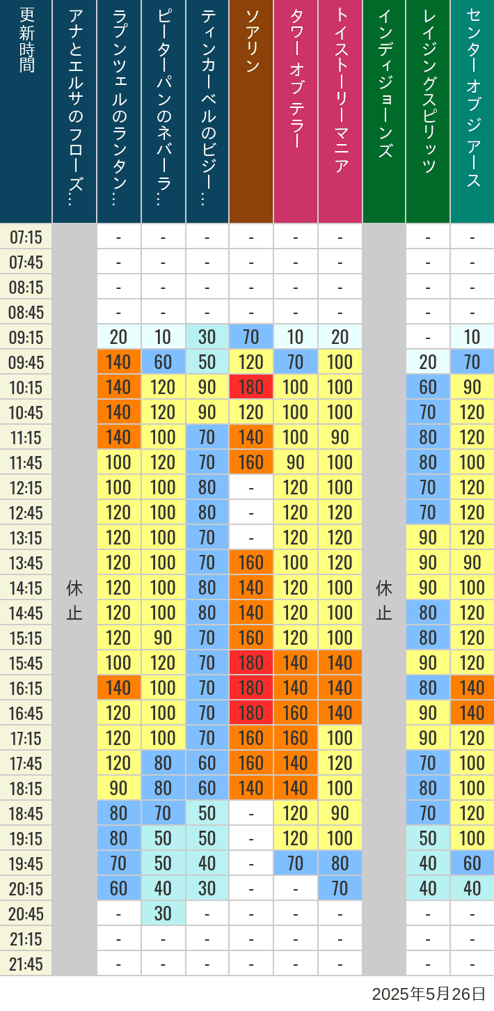 Waiting times for each attraction at Tokyo DisneySea on May 26, 2025. This is a table of wait times. It is color-coded in 30-minute increments.